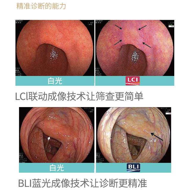 新一代ELUXEO 7000 内窥镜系统采用的蓝激光成像技术(BLI)及其联动成像(LCI)是目前较新的内镜成像技术,与其他的成像技术相比,BLI在对于消化道黏膜表面微结构及微血管诊查方面的性能得到提升。BLI采用独有的激光光源,使图像更加明亮、清晰,更具层次感,和LCI配置,无论在消化道早癌筛查还是癌前病变的精查中都显示出强大的优势,可一步到位完成精查,大大提高了病灶的检出率、良恶性病灶的辨别、幽门螺杆菌的判断,最终使患者获得更早更好的诊治。
